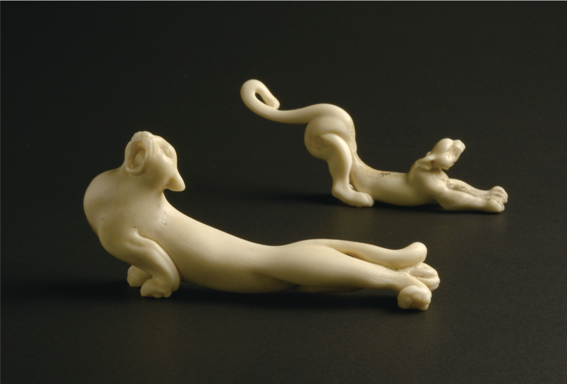 模索の軌跡が垣間見られる新作の根付彫刻10点あまりが並ぶ。