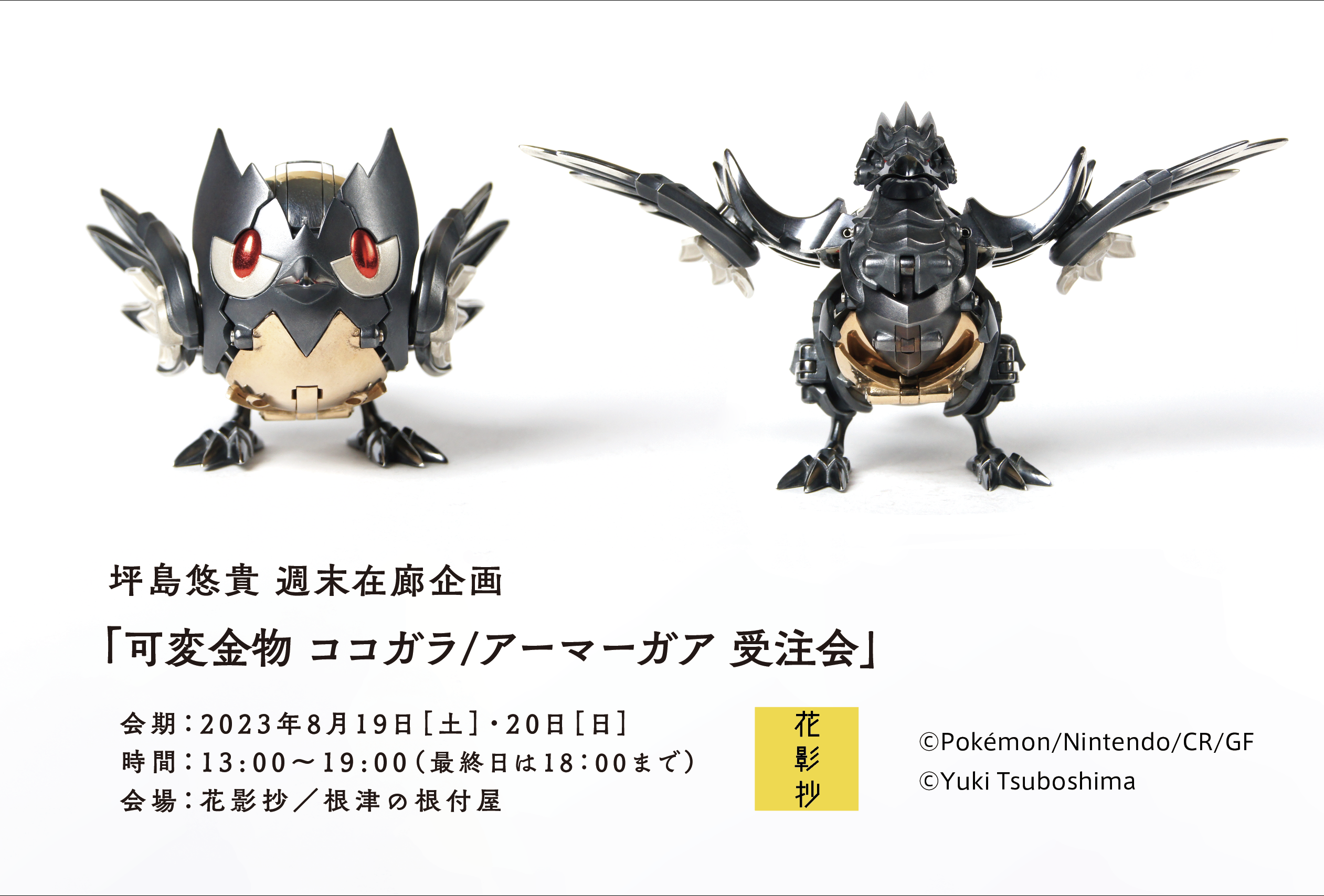 このたび、花影抄/根津の根付屋では、8月19・20日の2日間、坪島悠貴作品「可変金物 ココガラ/アーマーガア」の受注会を開催いたします。