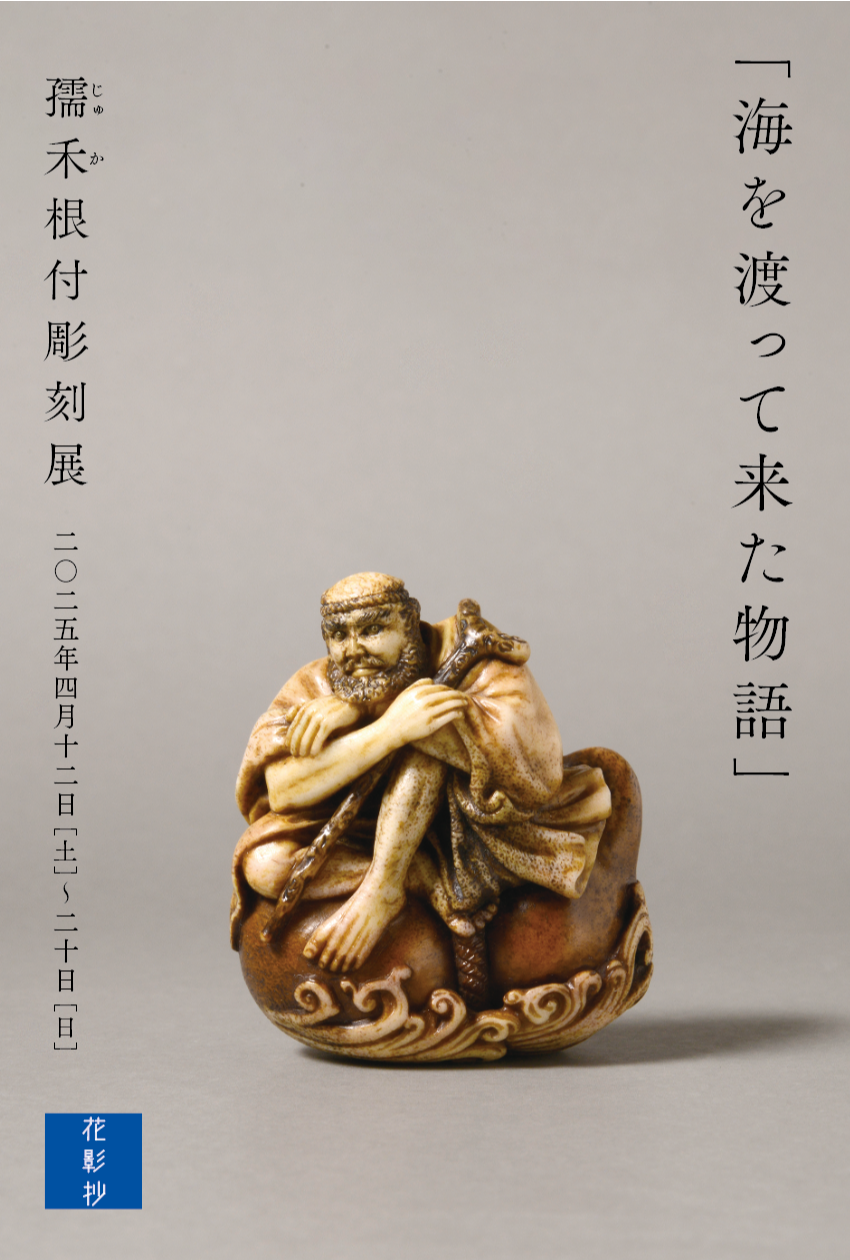 孺禾は、中国吉林省出身の彫刻家・王坤(wan kun)と佐賀県出身の画家・百武由里子(ひゃくたけ ゆりこ)夫妻が共同で根付作品を作るユニットです。2人でひとつの工房から作品を制作・発表するスタイルで、当初は彫刻家と画家の共同作業で1つの作品を制作しておりました。昨秋からは百武さんも根付彫刻を手掛け始めており、彼女が一人で制作した作品は「孺花」銘で発表しております。今回は、王さんが制作した人物根付に関連するアイテムを百武さんがシンプルな提げ飾り・根付として制作し並べることになりました。