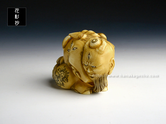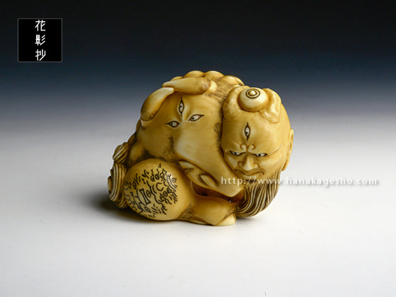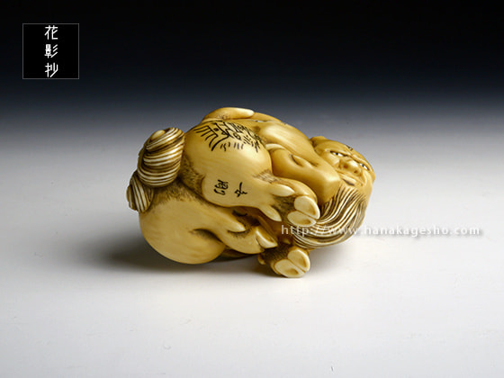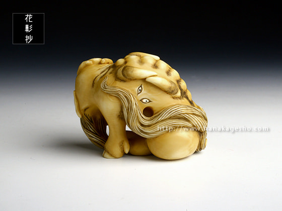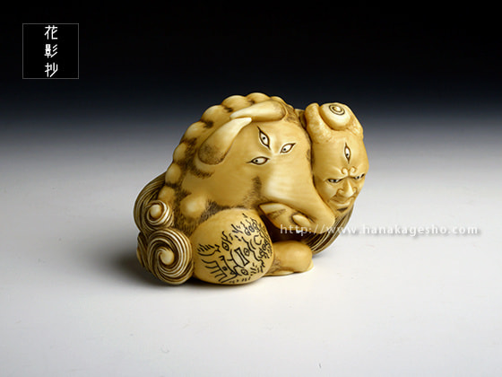 病魔を防ぐ力があると信じられ、幕末の安政5年(1858)の夏、コレラ流行のときなど、人々は白澤の絵を身につけたそうです。頭に宝珠を乗せたこの白澤根付、右後足の文様は、陰陽師安倍晴明の子孫、土御門家に伝わる霊符の中で、「白澤」とタイトルのついたモノを写しました。(安剛)