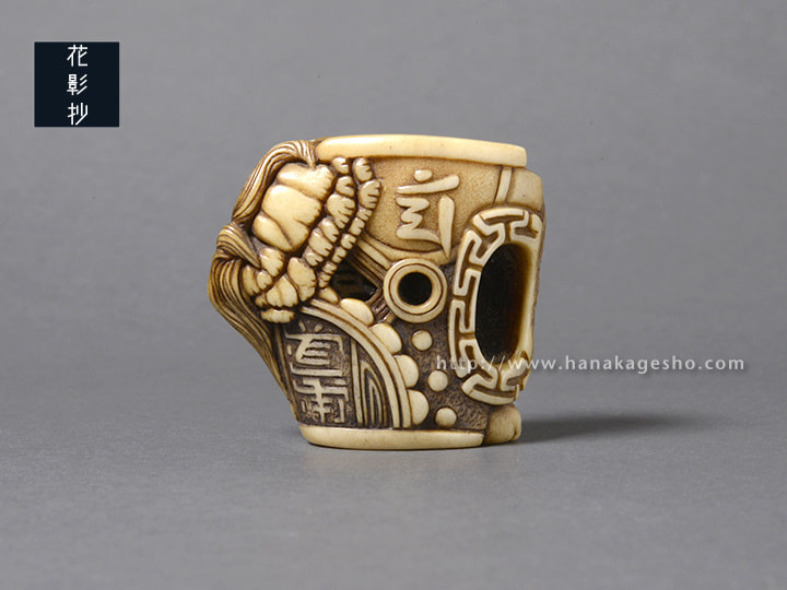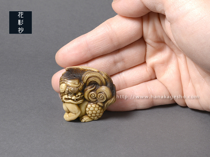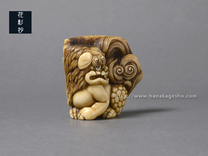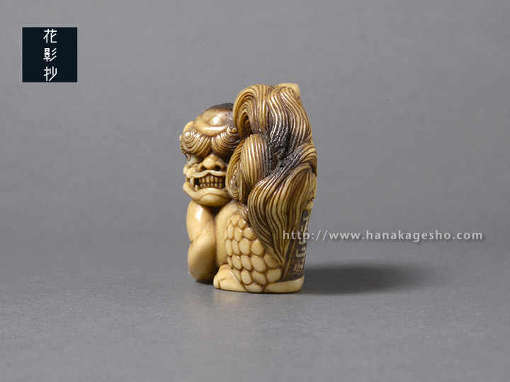 瓦片のような形状の中に、智慧の象徴である獅子(狛犬)が形彫りされています。端正な巻き毛ときりっとした顔立ちが印象的です。裏側には獅子を護る牡丹の花が咲きほころび、その傍らには文殊菩薩の梵字が添えられています。中央の紐穴左脇の一段奥まった箇所に隠れているのは、「福」の金文。小ぶりでまろやかな湾曲と適度な膨らみがあるため握り心地も良く、御守りのようにお持ちいただける根付だと思います。