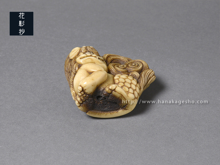 瓦片のような形状の中に、智慧の象徴である獅子(狛犬)が形彫りされています。端正な巻き毛ときりっとした顔立ちが印象的です。裏側には獅子を護る牡丹の花が咲きほころび、その傍らには文殊菩薩の梵字が添えられています。中央の紐穴左脇の一段奥まった箇所に隠れているのは、「福」の金文。小ぶりでまろやかな湾曲と適度な膨らみがあるため握り心地も良く、御守りのようにお持ちいただける根付だと思います。