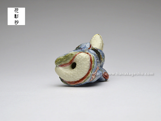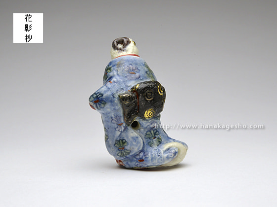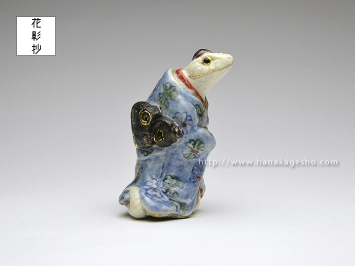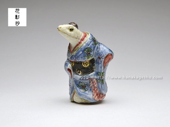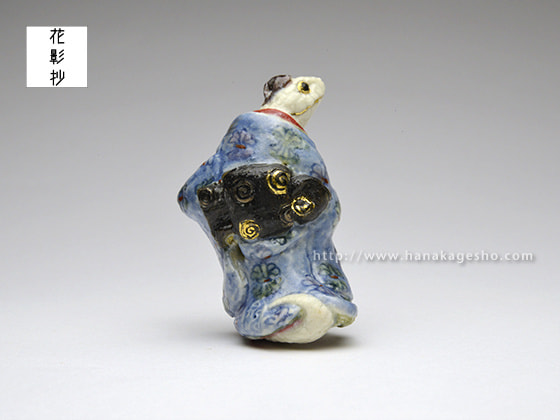 飛び抜けて容姿に優れており、1756年(宝暦6)「百千鳥娘道成寺 」で菊之丞を襲名、若女形の筆頭となりました。路考結び、路考髷、路考櫛、、、とその名のつくものが庶民の間に流行しました。道成寺にかけて白蛇に艶やかな女形を演じてもらいました。着物は路考の結綿紋、頭には紫帽子※。