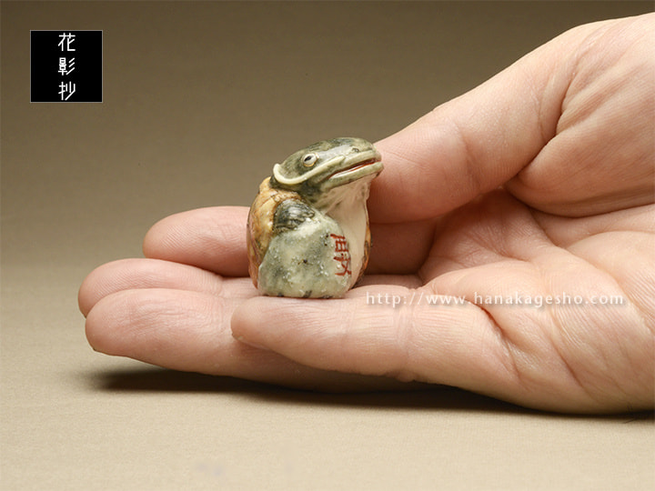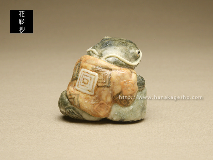 古くは地震を起こすのは、日本列島の下に横たわる、あるいは取り囲む龍・蛇(=地震蟲)の仕業と考えられていましたが、江戸時代にはすでに鯰にとってかわっていた様です。そもそも大地震の前に鯰が騒いだ、という伝承は様々な場所にあり、地震を予知してくれた鯰がいつの間にか地震を引き起こす悪者になってしまいました。安政の大地震後、要石が鯰を押さえつけている「鯰絵」やお札が大流行し、鯰が地震を起こす、という俗説は定着してしまったようです。「雨には困り〼(マス)野じゅく暫(シバラク)のそとね」は鯰絵の一つで、歌舞伎『暫』のセリフ「しばらくのつらね」をもじったものです。安政の大地震の被害で家屋が倒壊し、しばらくは野宿を強いられるという状況を伝えています。こちらの根付の鯰はやっつけられているばかりではなく、「本当の犯人」である「地震蟲」を要石で押さえつけ、「やれやれ」の表情です。着ている半纏は『暫』のアイコンにもなっている市川家の定紋「三升」です。(泉水)
