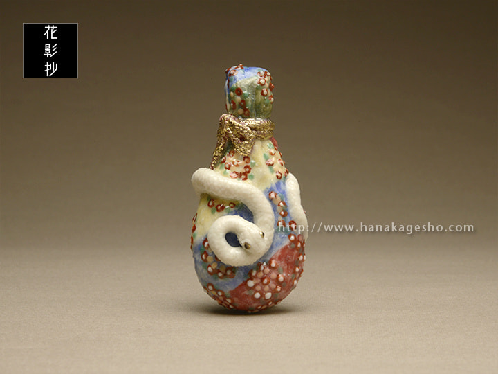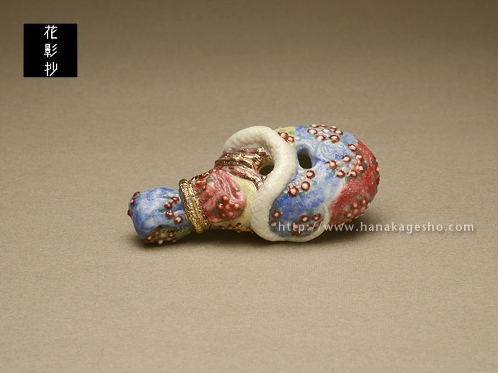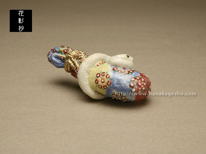 ヘビを神の使い、屋敷の守り神とする地域は多く、ヘビ(特に白ヘビ)を飼うと富むと言われ、また、弁天様のお使い、毘沙門さんのお使い、青大将はお諏訪様のお使い、と神聖化され、殺したり虐めたりすると罰が当たるとされます。弁天様は白ヘビの化身、白ヘビは弁天様の化身とされることもあります。北斎の「琵琶に白蛇図」を根付にしました。