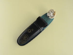 今回は「ピルエット」というモンブランの万年筆に合わせた根付と万年筆ケースのセットを、というご注文を頂きました。「ピルエット」という のは、バレエの踊りの型で、くるくると廻る様子だそうです。それをモチーフにした「ピルエット」は円をいくつも重ねたような模様でまるで水面に水滴をたらした時の波紋のようです。そんなイメージもあって、今回は「神の雫」という題名をつけました。ピルエットは万年筆ですが、その優美なデザインや貴石を用いているところから宝飾品にも例えられるとの事で、それほどに美しい万年筆に合わせる根付を、という今回のご注文は、大変難しかったです。素材は銀や真鍮などの金属素材を多く用い、アメジストや真珠も使い万年筆と素材感を合わせて、モチーフは鷺、と和風の味を加えて和洋折衷のような不思議な雰囲気を目指しました。そして、製作した根付と「ピルエット」の間を取り持つような万年筆ケースをイメージしてケースのデザインをし、それを丹羽レザースさんに製作して頂きました。革小物というものは、毎日触れて使われるものなので、まず一番は使い勝手の良い事。そして革という性質上、なるべく変形しないようにする事。そういった点を丹羽さんにご教授頂き、打ち合わせを重ねデザインを何度か変更。出来上がったケースはとても洗練されて、使い勝手も良く、そしてきれいな形で長く持ち続けられる。「丹羽さんのとても丁寧な仕事が感じられる万年筆ケースに私のデザインがのっている」出来上がった万年筆ケースを手に取った時、そんな嬉しさがありました。(かぶ)