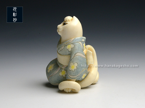 ある暑い日の夕方、猫又が縁側で夕涼み。あれ? ふと気づくと顔を洗っていました。白雨が降るのかしらね…庇の向こうに目をやる猫又。そんな情景を根付にしてみました。猫又の着ている浴衣にはマタタビの花をあしらいました。マタタビは別名、夏梅とも言うそうです。