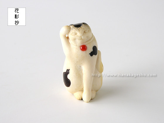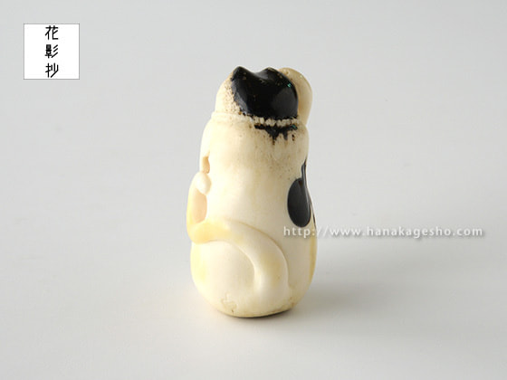 「一猫(びょう)+五ひょうたん=むびょう。飼っている猫ちゃんにも飼い主様にも猫好きの方にむびょう息災の意味を込めて作りました。ひょうたんのひとつは根付用の紐穴になっていて、提げても根付としてもお使いいただけます。猫の模様に漆を使ってます」(かぶ)