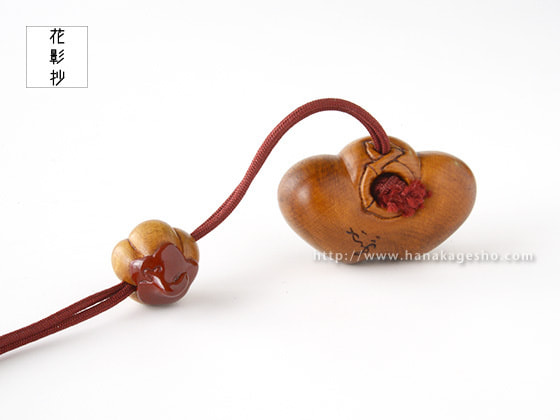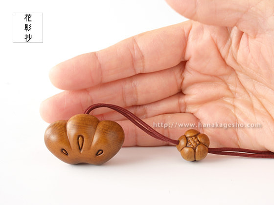 「紐穴を竹、緒締を梅にしてお目出度い松竹梅を表しました。提げても根付としてもお使いいただけます。仕上げに拭き漆をしています」(かぶ)