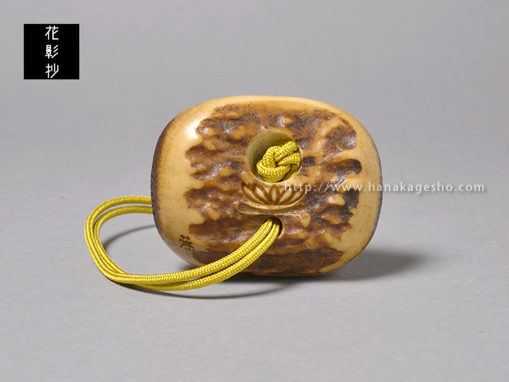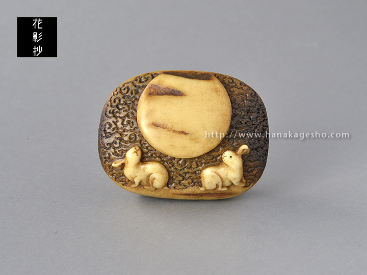 月待信仰という言葉から発想して図案を考えました。十五夜、十九夜、二十三夜など特定の月齢の夜に集まるという行事だそうです。月の夜に集まるという行為がとても神秘的に思え作ってみたいと思いました。兎の姿は東京国立博物館で開催されていた大覚寺展での腰障子に描かれた兎を参考にしています。紐穴を月に見立て蓮と組み合わせて月輪の図にしました。(蕪)