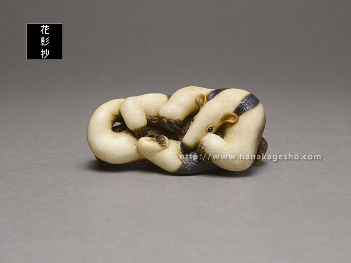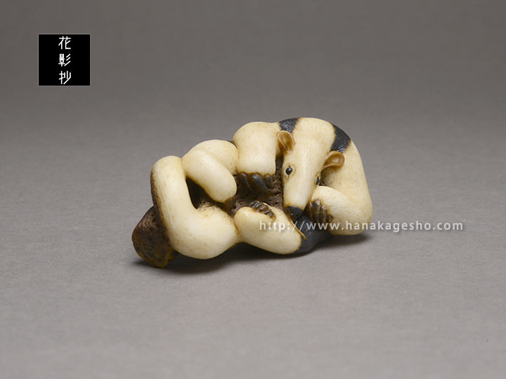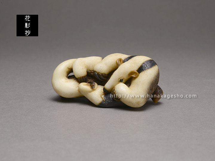 最近とても気になっている、ミナミコアリクイを根付にしました。ミナミコアリクイはとても尻尾の力が強いようで尻尾で体重を支えられるので、根付としてどのような姿にしようかと考えて、木に尻尾を絡みつけてぐっと身体を持ち上げている姿にしてみました。(蕪)