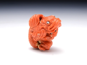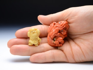 「子鬼が笠の代わりに読んで字の如く"鬼"、"笠"、"子"、鬼笠子!を被って鍾馗様を威嚇しています。 普段は鬼だけなら鍾馗様の方が圧倒的に優位なのですが、巨大で険しい顔をした鬼笠子を前にたじたじになってしまっています。 子鬼もここぞとばかりに鍾馗様に鬼笠子をみせつけている様子を表現しました。 古典の根付では子鬼が笠を被って鍾馗様から隠れる図案が多いですが、海の魚"鬼笠子"の名前を見て、この根付を思い付き制作しました。(森謙次)