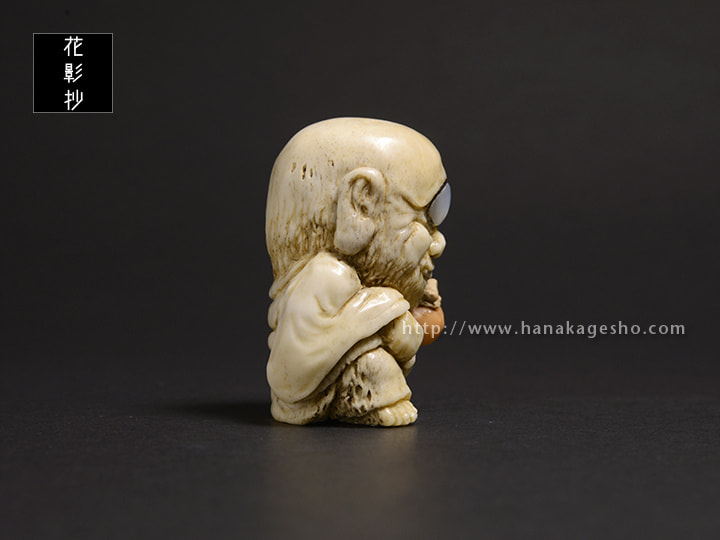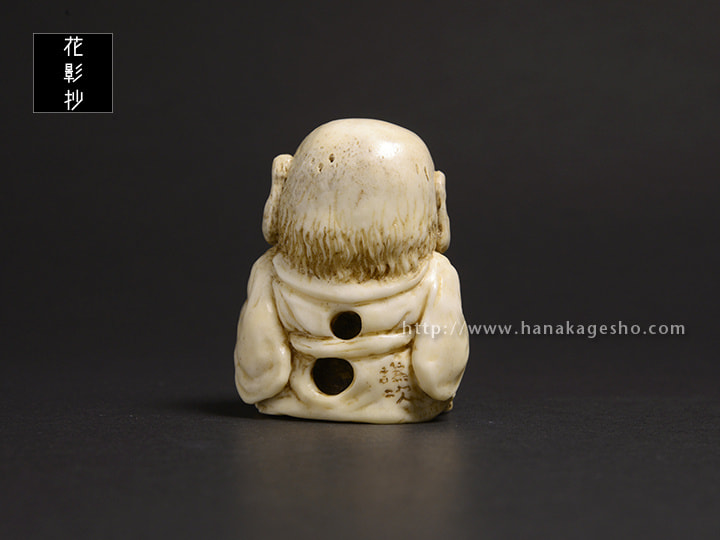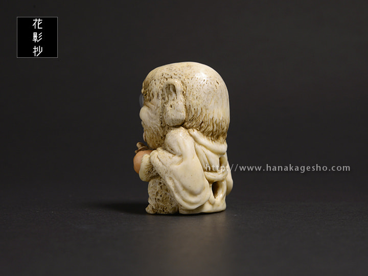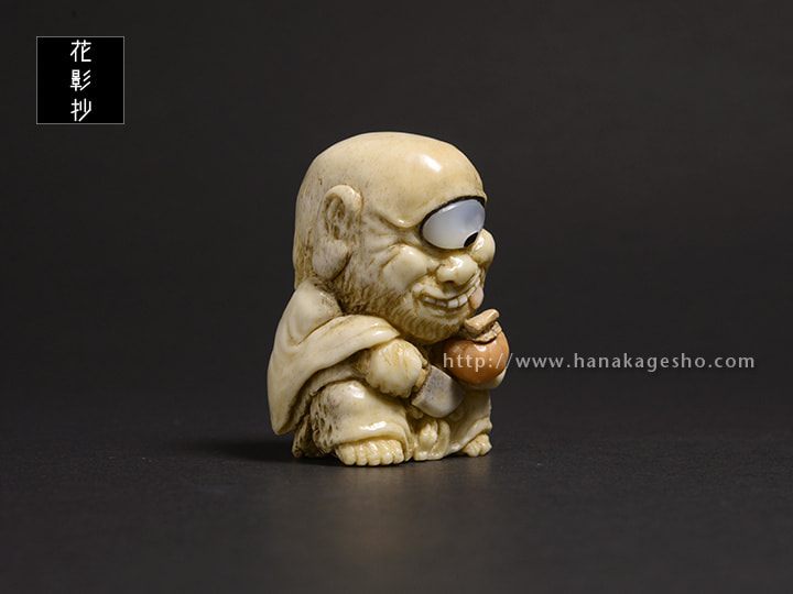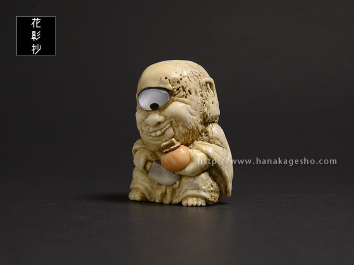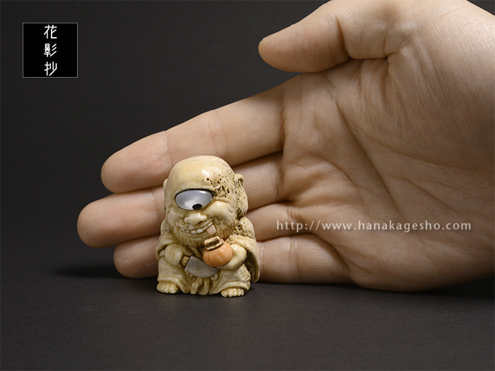 未熟なお坊さんが妖怪になったといわれる青坊主。成熟した柿を食べて何とか成長したいと思う前向きな根付です。(森謙次
