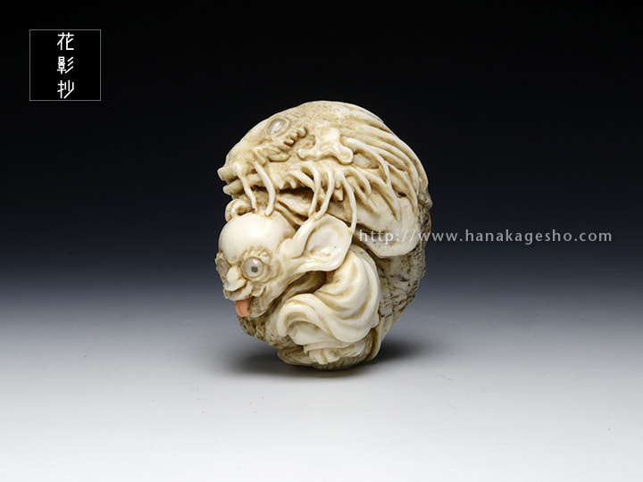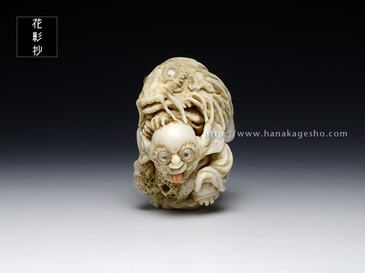 幕末の絵師・高井鴻山の《七妖怪図》に描かれた二妖怪をもとにした根付。この根付を作っているとき、ヤドカリとイソギンチャクの共生のことを考えていました。それぞれ違う強みや弱みを持つ生き物が、互いに補い合って生きる姿っていいなと。(森謙次)