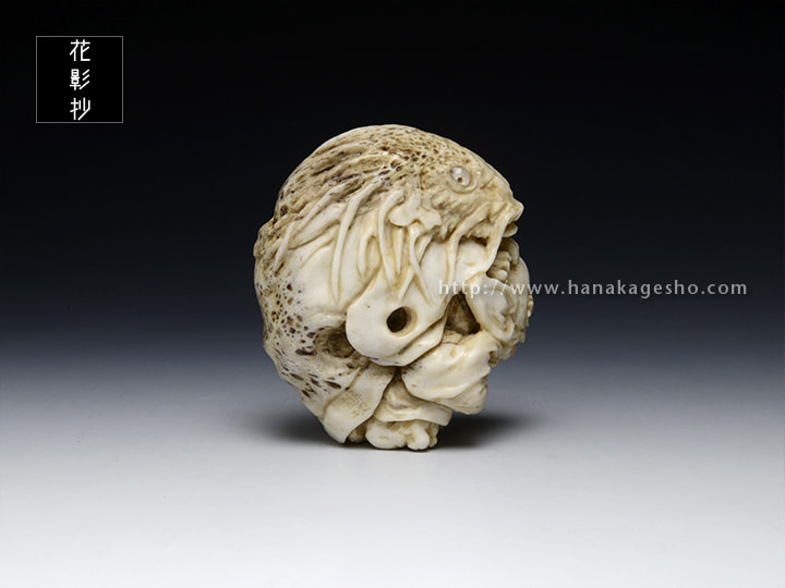 鹿角 象嵌:水晶、猪牙、水牛角(目)・珊瑚(舌)