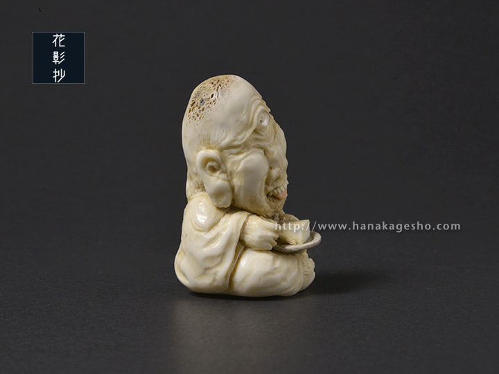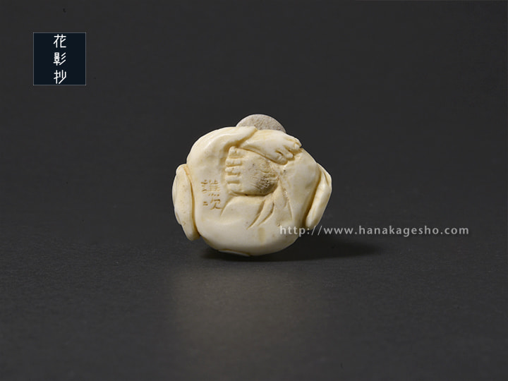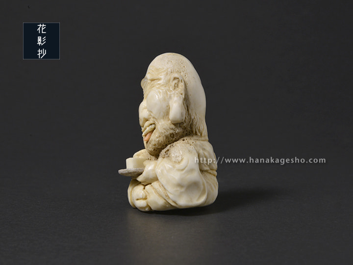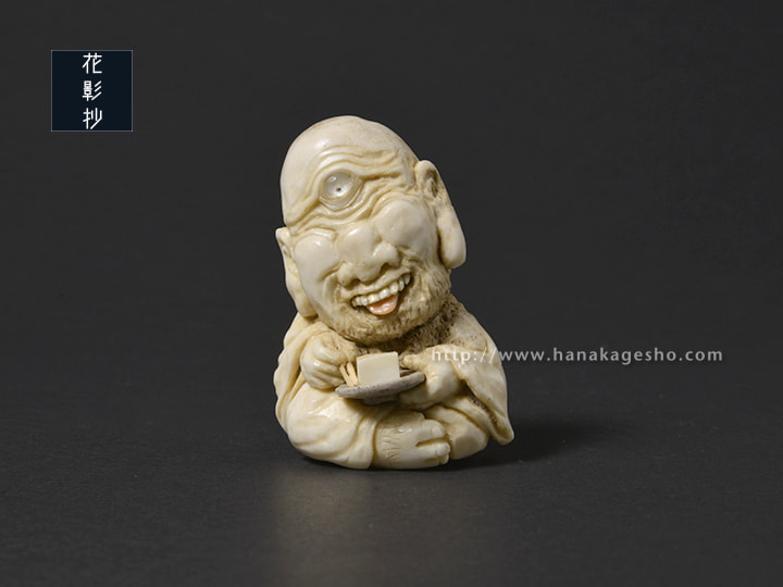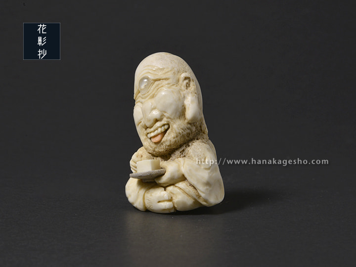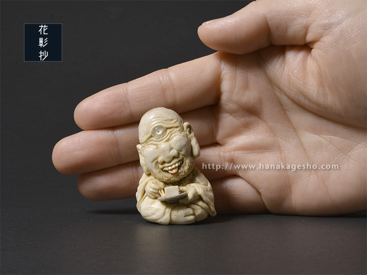 大入道をモチーフとした根付は約10年前に河鍋暁斎の「百鬼夜行絵巻」に登場する大入道に惚れ込んで以来、何点も作ってきました。自分にとって大入道は、もはや親戚みたいな存在かもしれません。今回は、豆腐を手に得意げな表情や仕草の大入道が活き活きと魅力的に見えるように力を注ぎました。(森謙次)