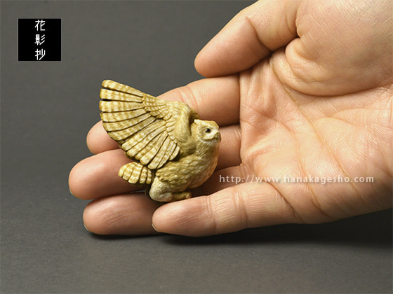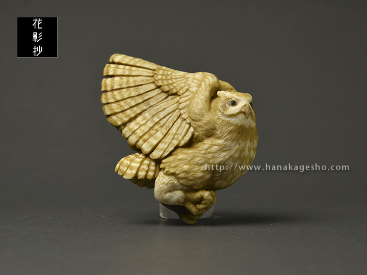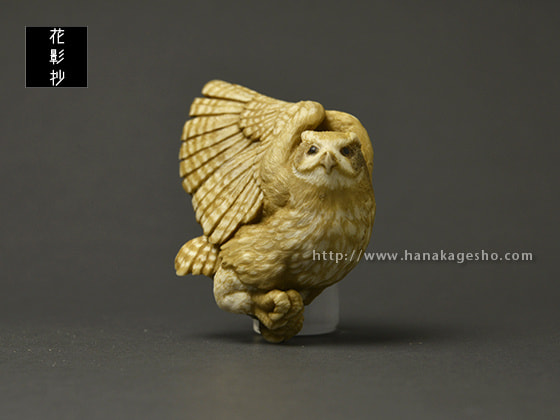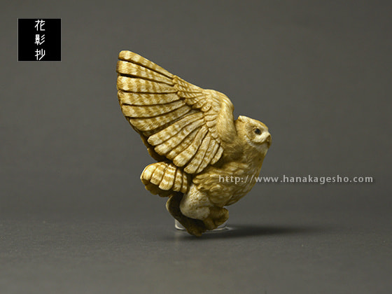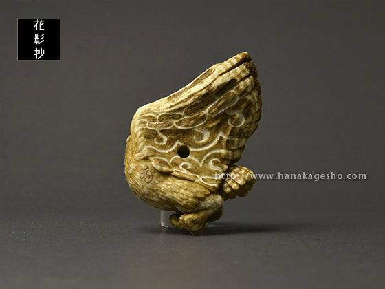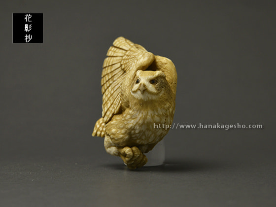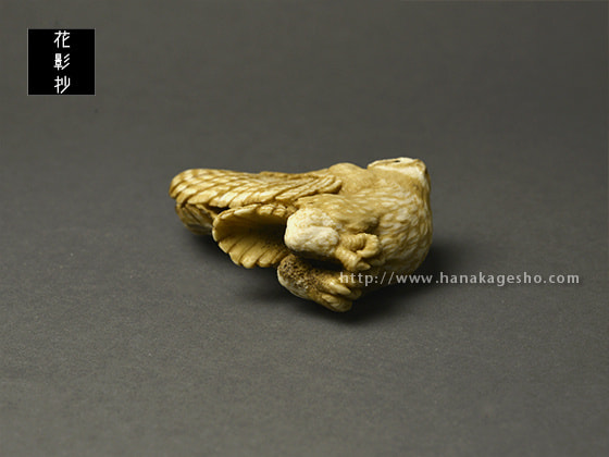 鹿角の形を活かしてシマフクロウを作りました。皮目はそのままにしようかと思いましたが、アイヌ風文様を施してみました。羽先部分から紐を通して提げにもできます。アイヌでは人間を見守る豊穣の神だそうです。(狛)