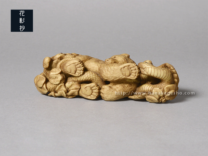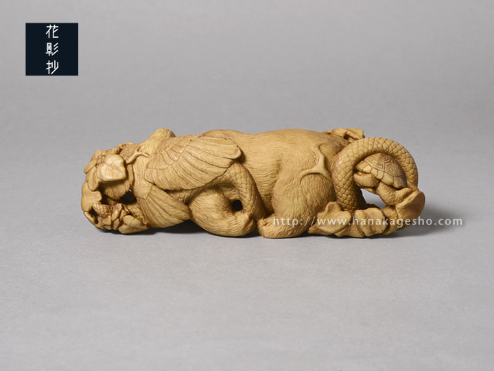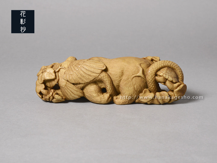 狛の故郷島根県の出雲国風土記によると神名火と呼ばれる山は4つあり、今回四種の動物を作ることに繋がりを感じた。神聖な森を想起させる名前にしようと思い、引用した。(狛) |