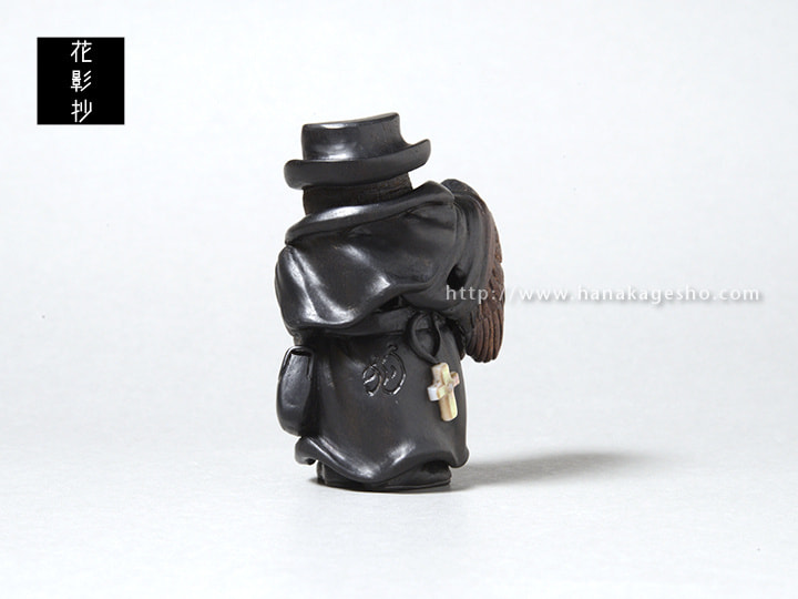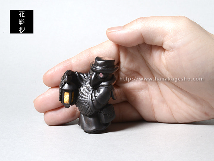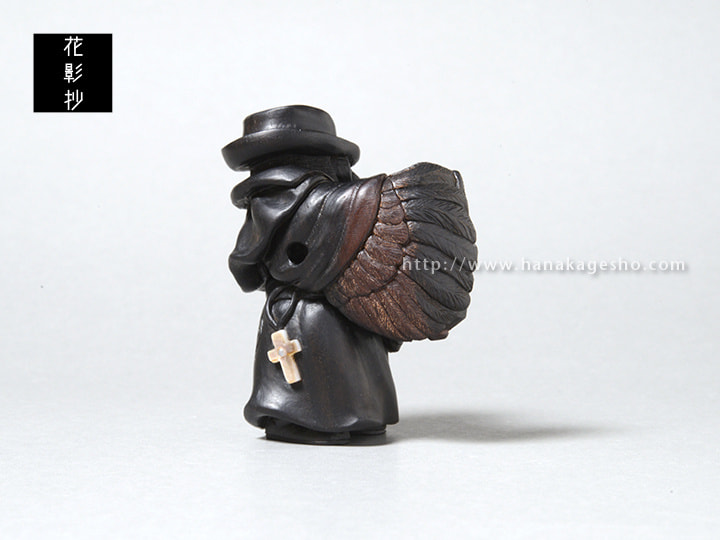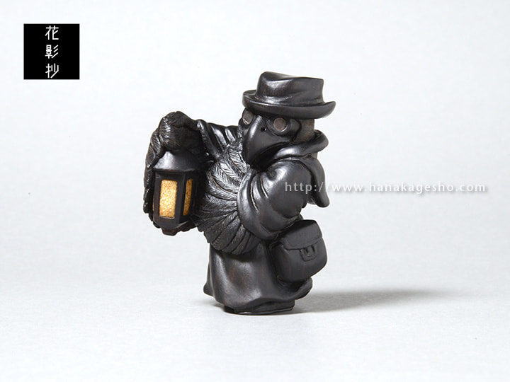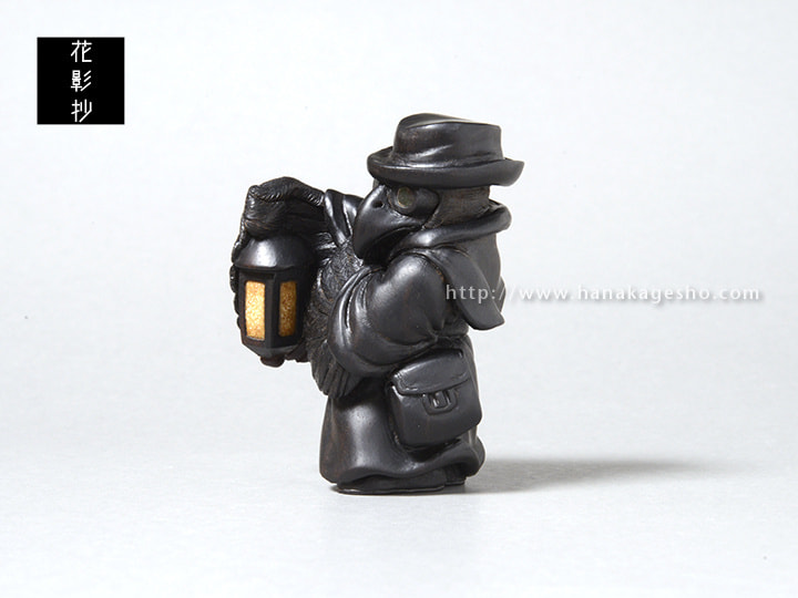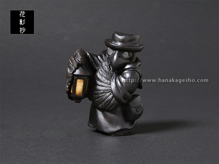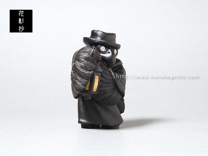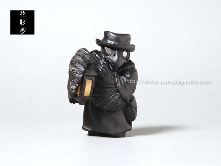 ヨーロッパペストの大流行時に治療に当たっていたペスト医師の姿をモデルにしている。まだ菌やウイルス等の病原体の概念がない時代、医学は迷信や祈祷と混ざりあった非科学的なものが多かった。瘴気が病気を起こすと信じ、鳥のような長く口の伸びたマスクを被り、中には香草を詰め、ワックスを塗った服で体を覆った。病気の本質は違っていながらも、後の感染症対策の先駆けとなる姿が興味深い。ペストへの恐怖から、人々はペストと接する医師達も恐れた。彼らの目からは医師達の異様は死神のように映ったことだろう。弱った獲物や遺体をついばむカラスのように。(狛)