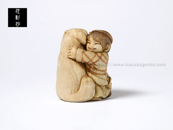 昔、うちでは大型犬を飼っていました。小学校から一緒に育ってきたので末っ子の僕にはいい遊び相手。力は強いのですが気が弱くて、ちょっと情けない表情が大好きでした。ちょっと離れたところに大きな公園と池があるので、長々1時間かけて散歩に連れて行ったのはいい思い出です。モデルを僕にするには照れくさいもので、子供姿の奥さんとうちの犬に仲良しになってもらって作品にしました。(狛)