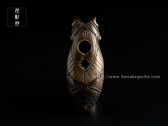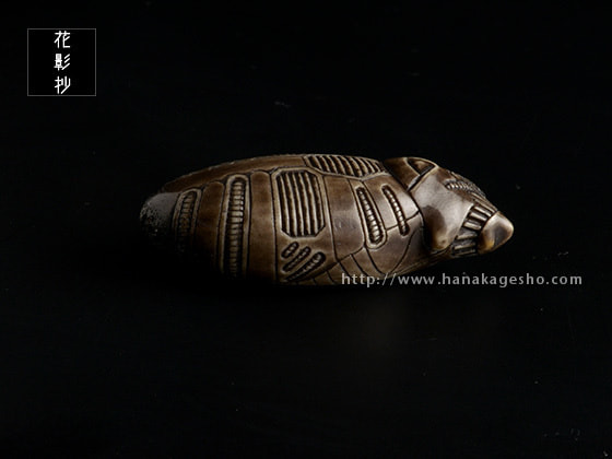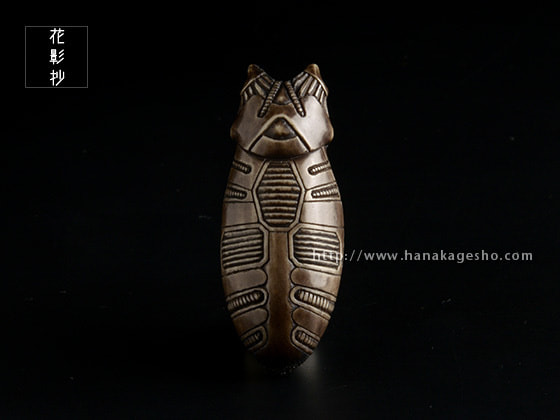 「“生物の機械化”というテーマを掲げてみて、制作の際に強く“未来”という事を意識するようになりました。今回のモチーフは1作目に引き続き、蝶の蛹です。いつの日かヒトが生物を改造するのか、生物がヒトの文化を取り込むのか、はたまた、ヒトが絶滅した後の世界で生物が進化を果たすのか…。この根付が完成した際、願わくばここから生まれてくる蝶もまた、美しい生物であってほしいと感じました」(カタクラケンタ)