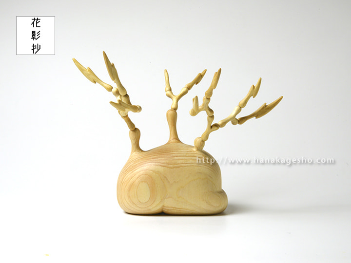 「連作《終わりへのスタディ》。このシリーズは自身に必ず訪れるであろう ”死 “に対し、その恐ろしさを和らげるというテーマから制作を開始しました。美術史を紐解いてみるとメメントモリ (ラテン語で「死を忘ることなかれ」という意、今生を楽しもうという趣旨にもとれる )という言葉が存在するように、「生と死」にまつわる主題自体は現代に至るまで語り尽くされているのでは?と思えるほどに多くの作家たちが扱ってきた人類に共通する普遍的なテーマと言えます。そこにあって自身がテーマに扱う動機として、人類全体がどうというよりもまず制作行為を通して自身が抱える漠然とした死の概念を補完することとしました。死の受け止め方に対する観念を充実させるのは宗教や哲学の役割でもあると考えているのですが、決して信心深くもなく主義思想も希薄な環境で育った自分にとって日々の生活の中で死を意識させられる印象深い物と言えば桧でできた仏壇といった形式的な仏具しか存在しませんでした。後に勉学として哲学にも触れますが、どこか当事者性に欠けるような印象しか持てず現実感に結びつかなかったと記憶しています。一連の作品はそんな精神的な寄る辺を持たない自身がどうしようもなく迫る死に対して、そのものを捉え直す事で少しでも安らかな終わりを迎えられないだろうかという試みでもあります。作品の土台にあたる部分は生物が倒れ伏している姿や折れた樹木であったり加工された肉としての姿などを抽象的に造形しており、各作品はそんな骸を模した土台から分裂する細胞のような節を広げ、周囲に記号的な形状の突起を伸ばしています。それらは土台と突起物の関係や「魂の所在」「肉の記憶」といった副題とともに複数の側面から死という事象に対する問いを投げかけます。個展「彼我の境」の開催にあたり、工藝・民藝の文脈を組みながら生物を主なモチーフとして具象的な表現で発表している根付彫刻の対比として、死の概念にアプローチする抽象的な立体造形作品を置くことで自身の表現における境界をも探るような展示としました」(カタクラ ケンタ)