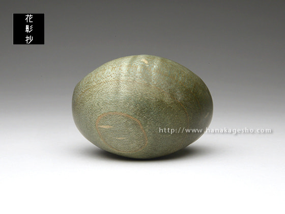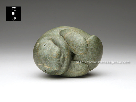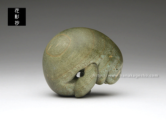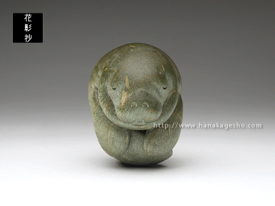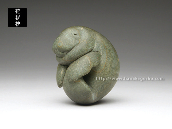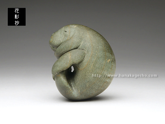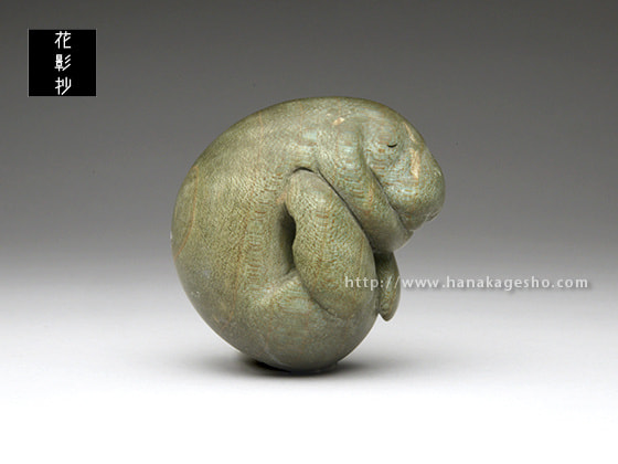 マナティが穏やかな海の中を漂いお昼寝している優しい風景です。楓の染色された木目が、水中での光の反射や波紋のように効果的に見えています。根付らしい丸いフォルムとサイズ感で手のひらになじみます。飾るときの台座つき。(根津の根付屋)