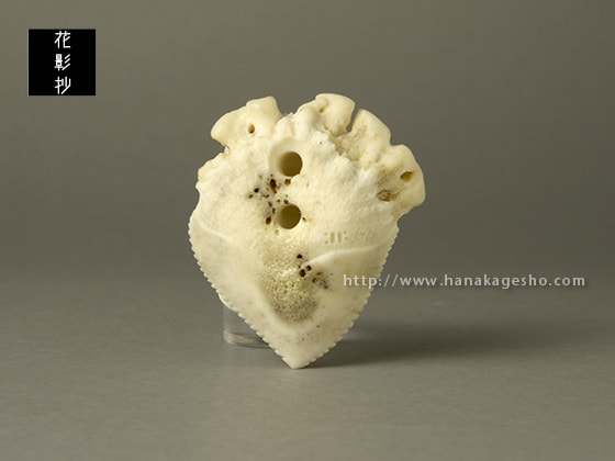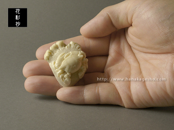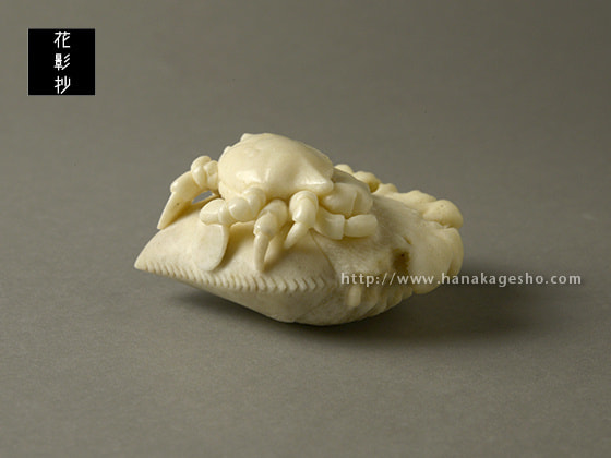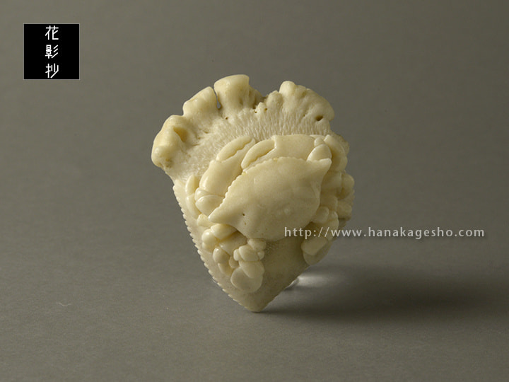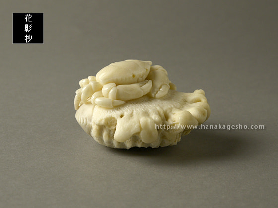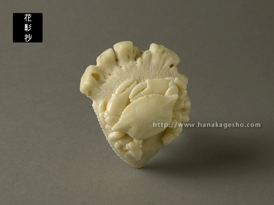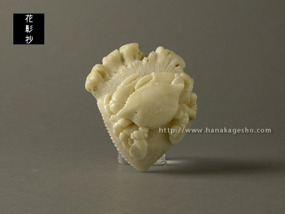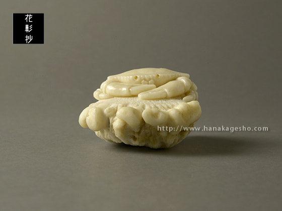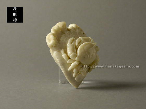 今回は「鮫の歯に乗る渡り蟹」という題材です。いくつかの直近の作品で生き物が何かに留まっている構図を制作してきて、その発展形といったところです。先に完成像が浮かんできてその時点で自分がグッときてしまった作品なので、特に余計な意味付けもせず素直に格好良いと思える根付像を求めてみました。写真で全体像をお伝えすることが難しい作品なので、ぜひ直接お手元でご覧いただければ幸いです。(カタクラケンタ)