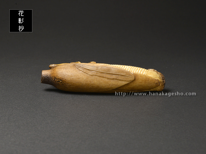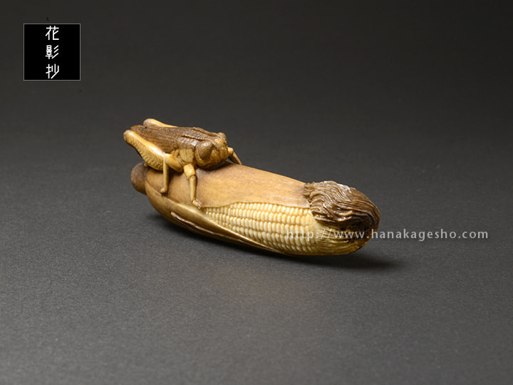 今回はとうもろこしにイナゴ、というテーマで彫刻してみました。美味しそうな野菜に虫が留まるアンティーク作品にも見られる構図を真似つつ、私たちが生きている時代性を映すようなモチーフとしてこの組み合わせはどうか?と選択しています。完成してから知ったのですが、秋田県のほうではどちらも美味しく食される食材という話を聞きました。その話を聞くまで全く無意識だったんですが、子どもの頃に祖母に食べさせてもらったイナゴの佃煮の印象が、この作品で彫られているイナゴの大きさとピタと重なり自分で驚いています。年を重ねた自身が知識や経験を元に考えた作品でありながら、どこかで幼少期のカタクラ少年の記憶と接続した作品になったのかなと感じています。(カタクラケンタ)