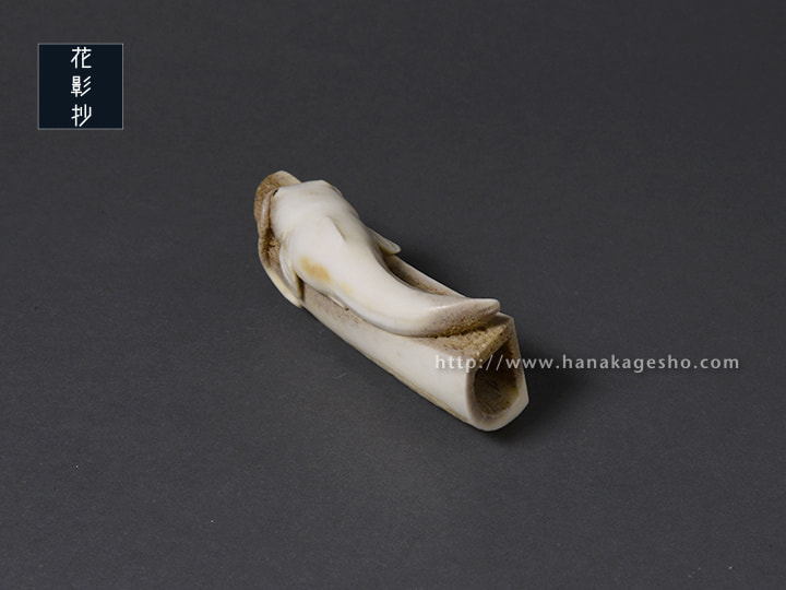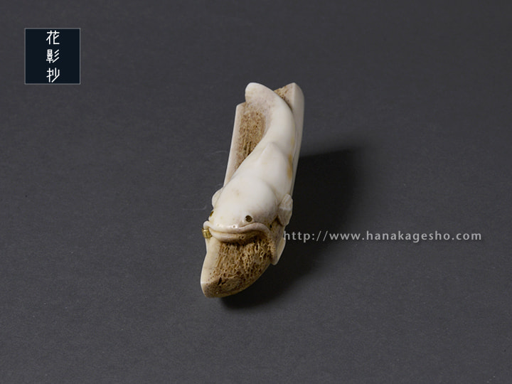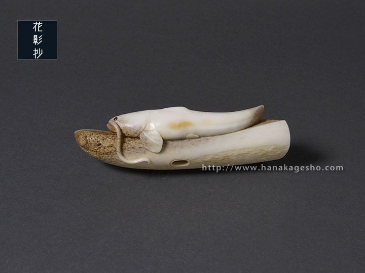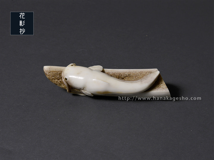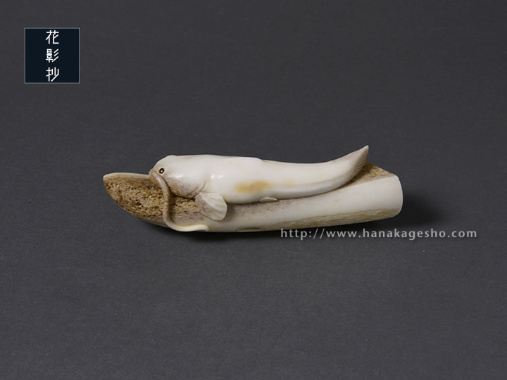 今回のモチーフにはナマズを選んでみました。古来、日本においてナマズは地震と縁が深い生き物として語られてきたことはご存じの方も多いかと思います。やはり根付においてもアンティークから現代に至るまで普遍的な題材として扱われてきました。今作品では、先達の根付作品群で散見される尾鰭に向かって体躯が丸まっていく構図ではなく、牙型の土台の長さを活かして伸びやかでリラックスしてるようなナマズを目指しました。また、何か現代的な装飾の要素を入れてみようということでヒゲにワンポイントを入れてみています。写真では全貌も伝わりづらいかと思いますので、ぜひ直接ご覧いただければ幸いです。(カタクラケンタ)