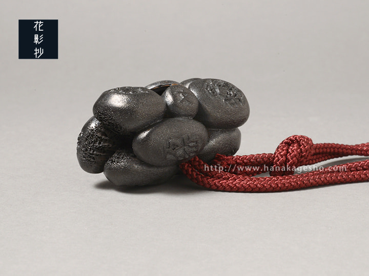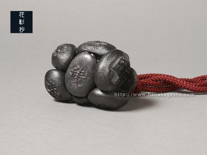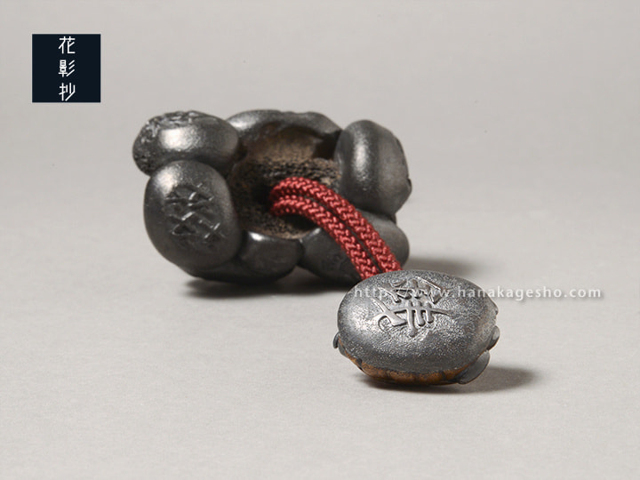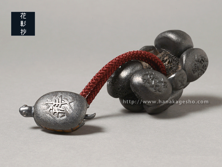この作品をよく見ると、豆板銀の塊の中に銭亀が……!! その頭と尻尾が動く仕掛けになっています。金運アップのご利益が込められた根付です。 |