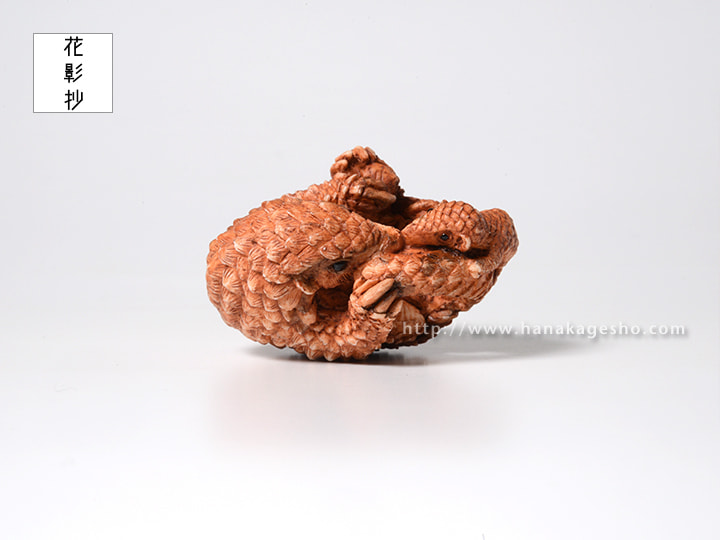 「僕が見て、触ったことがあるのは今回のモチーフであるミミセンザンコウという種類のセンザンコウで、あとのセンザンコウは憧れの存在だ。今回のは憧れではなく、友だちのような隣人のような、それとも僕自身の分身のような、とても近くに思っている存在。だから情景や心情を前のセンザンコウ2作よりも込められた(自然と込めてしまった)作品になった。去年から続いている親子をテーマにした根付の中でもとてもとても僕自身に近く、思い入れの強い作品になってしまった