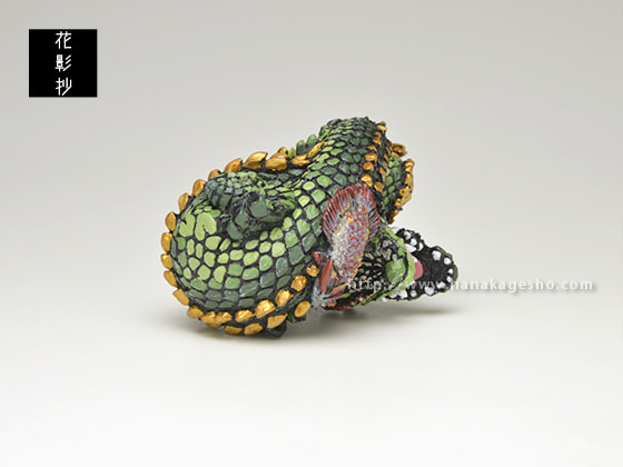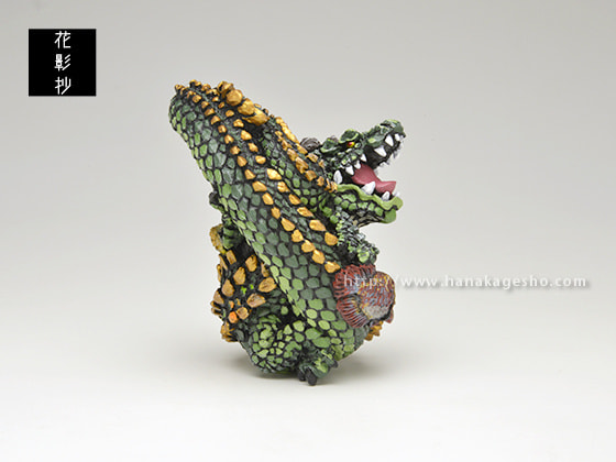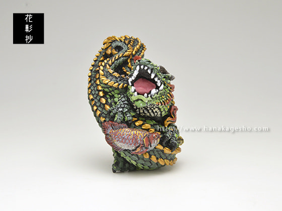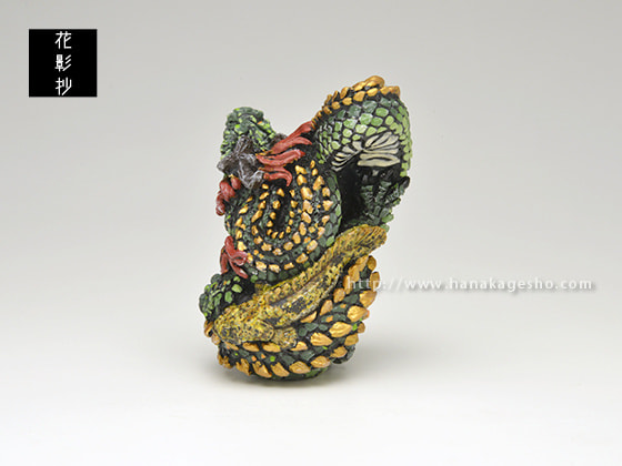 さて、というわけで「辰」。 僕は今までの龍モチーフの僕の作品の中ではとても気に入っていて、ひとつはリアル(生物としてのリアル感)すぎないこと、それから僕ならではのバランスに落とし込めたこと、そして前述の寄り添わせた生き物の選択のちょうど良さ、が僕のなかではなんとも心地よく、今作りたいと思っている雰囲気にピタリとはまった気がしたからです。 龍は実在の動物ではありませんから、いままでずっとどこかに戯画的な要素を入れ、あまり生々しくしない方向で制作してきました。今回もそれを踏襲しつつ新しい表現も試みました。口を開いた龍は根付では初めてです。また今回は遠近感の要素もいつもよりも意識して取り込みました。また、僕が龍を作る際どうしても意識してしまう動物である「ワニ」の存在は今回もいろいろなところににじみ出ていると思うのですが、それをうまく取り込みながら、戯画的な龍の姿を表現できたと思っている次第です。 それから添わせた生物ですが、今回はアジアアロワナとポリプテルス・エンドリケリーです。どちらもアクアリストの間では龍と呼ばれることのある古代魚で、そのどちらとも僕のフィバリットモチーフのひとつです。それをどちらか1種だけではなく2つとも盛り込んだときに、なんとも言えない満足感(とても私的な満足感ですが)を得ました。と同時にこれは僕ならではな表現になったな、という確信も得たのでした。 僕の今の表現がたくさん詰まった作品です。 よかったらお手に取ってご覧いただけたら嬉しいです。( 守亜) |
