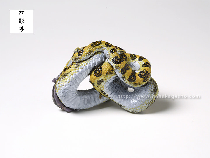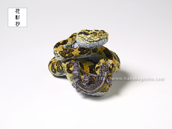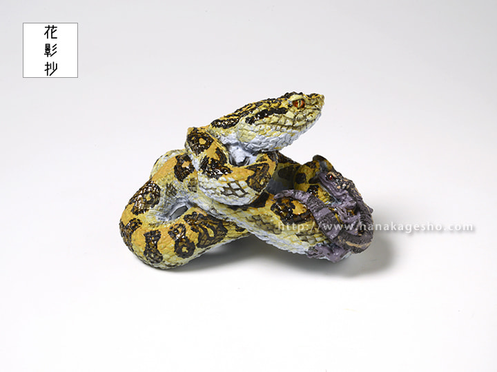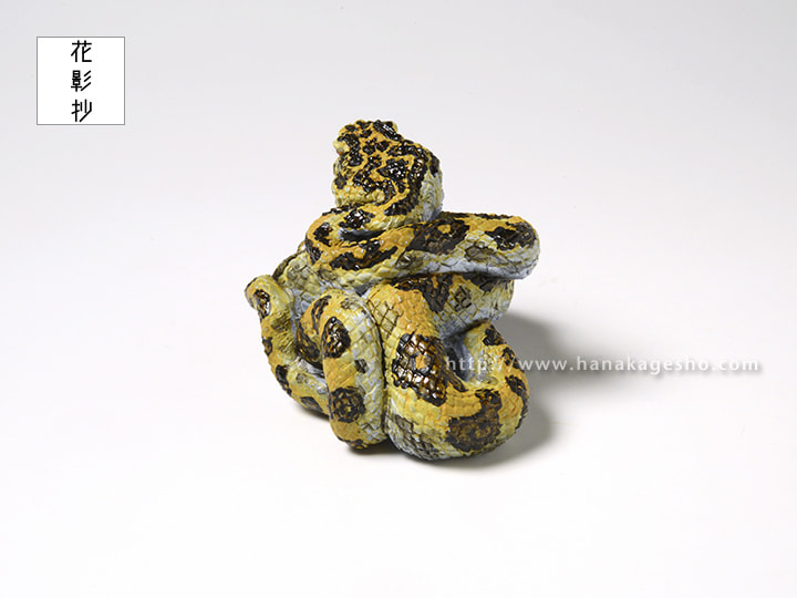 干支根付「巳」について 巳、ヘビです。 この干支根付は個人的な思いを盛り込んで制作しておりますが、今年もそのように作っています。モチーフはハブ(ホンハブ)とクロイワトカゲモドキでどちらも沖縄に生息する爬虫類です。どちらも沖縄県北部のやんばる等で見ることができますが、僕が見ることができたのはクロイワトカゲモドキだけで、ホンハブはまだ野生では未見です。いつか見てみたいものだと思っています。ホンハブは一般的に知られている毒蛇というイメージだけではなく、日本で最大級の大蛇でもあります。また黄色と黒のまだら模様はとても美しく、個人的には全ヘビ中で1、2を争う美しさ、かっこよさだと思っています。そういうハブを一度きちんとした形で作りたいと思っていたので、今回の巳年のモチーフとして迷わず選びました。特に頭部の鱗の配置、その綺麗な並びが独特で見ていただきたいポイントです。 新作「巳」根付と新しい年をお迎えいただけましたら嬉しく思います。( 守亜) |