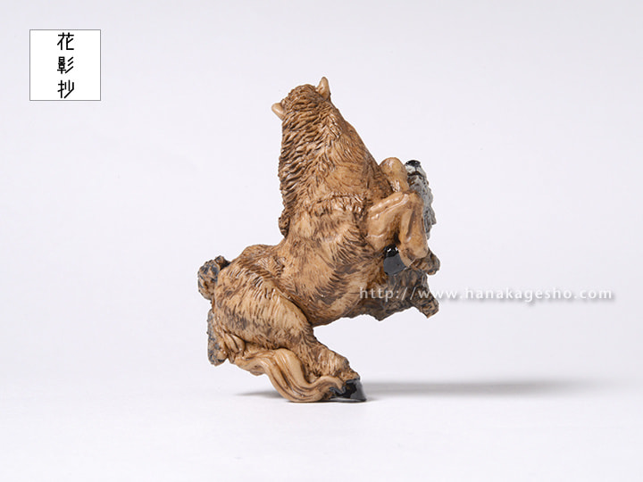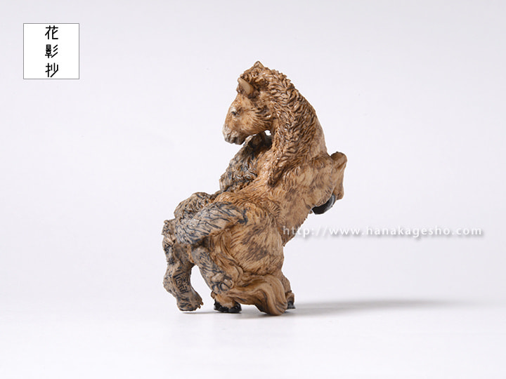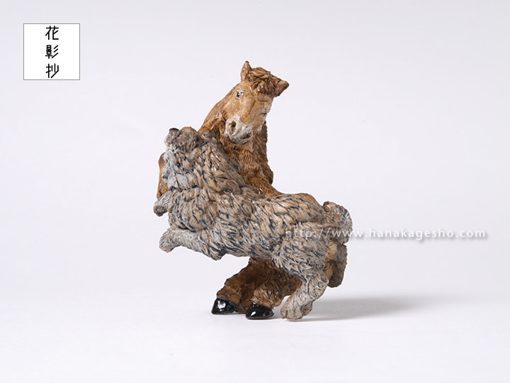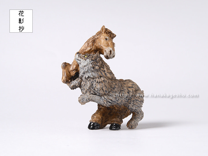 お待たせいたしました。干支根付「午」完成いたしました。この午をもって干支根付もいよいよ後半戦がスタートしたわけです。長らく酔狂にお付き合いいただき感謝しております。というわけで午、ウマですね。このシリーズは基本的には野生の動物をモチーフに制作しています。ですので、午、そして来年の未あたりは必然的にモチーフとなる動物が絞られてくるのですが、今回はある意味でのストレート、「モウコノウマ」をモチーフにモンゴルの豊かな草原を疾る姿で制作しました。相方に選んだのはこれもモンゴルに棲息するオオカミです。もちろん実際の野生下においてはこの2頭は捕食する、されるという間柄ですが、今回においてはライバルでもあり、相棒といったイメージです。全く個性も性格も違うもの同士がタッグを組み、共に走るという得意を活かして大自然を生き抜いていく、そういう姿を夢想しました。意見やそもそも生き方が違う同士でも手をとりあうことができればいいのになあ、なんて2025年を振り返ったりしたものですから……。(守亜)