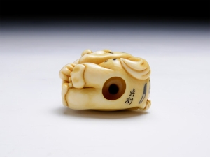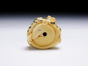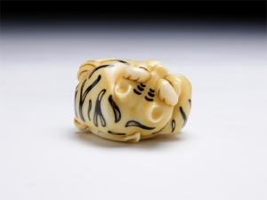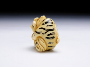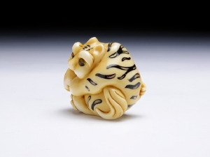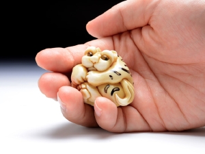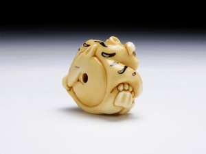 今回の根付は、こんなお人好しの虎に対して、狡猾な狐が虎の威を借りながらも、尚も自分の尻尾を虎の脇の下から出して、からかおうとしています。でも、のんびり屋の虎は泰然自若として、一向に気づかず、ずる賢い狐は、虎のお尻を摘まんで一捻り・・・