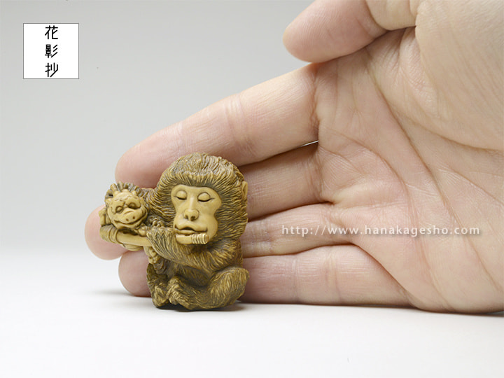 龍仙人という根付の題材がありますが、その龍仙人の外出中に、山の子猿が山道で見つけた篠笛の音色を、仙人の龍の子と一緒に楽しんでいる様子を根付にしました。楽しんでいる子猿の顔や、(少し自分なりの)毛並みの表現に苦労しましたが、ほのぼのした楽しげな雰囲気が出せたかなと思っています。紐の出る側の穴には、龍が水の神であることから、水が跳ねているデザインの紋様を彫りました。