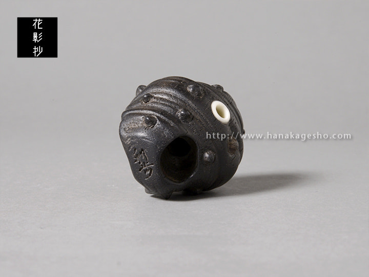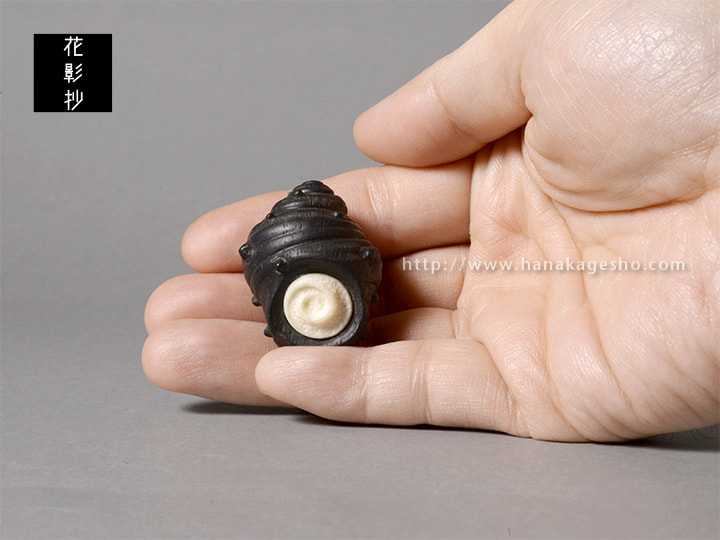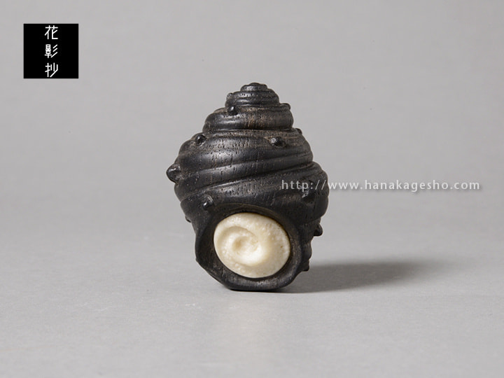 戦国期の変り兜、栄螺形兜(さざえなりかぶと)の風合いを取り入れた、黒い栄螺の根付です。栄螺は、殻の硬さが具足の強度の高さを想像させ、また「栄」の字が縁起の良いことから、武将たちは栄螺の造形を好んでいたとのことです。