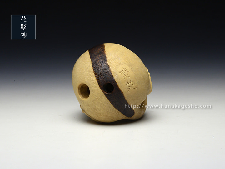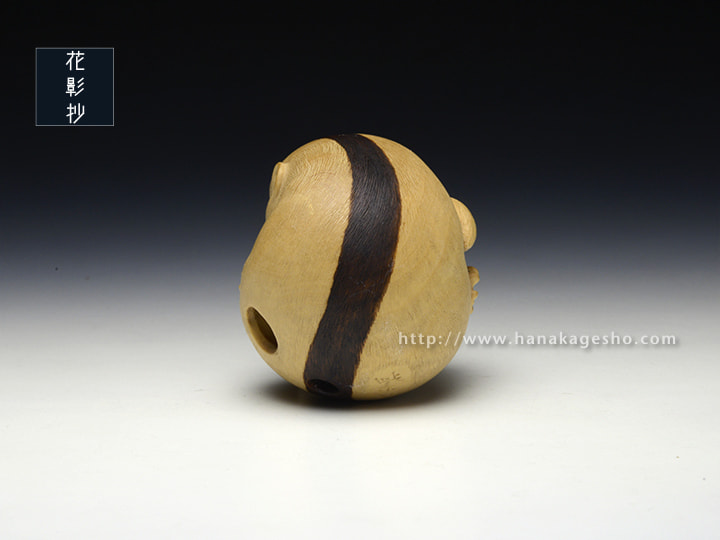 漆使用(背中の縞)。「木彫根付選集2025」にて発表。