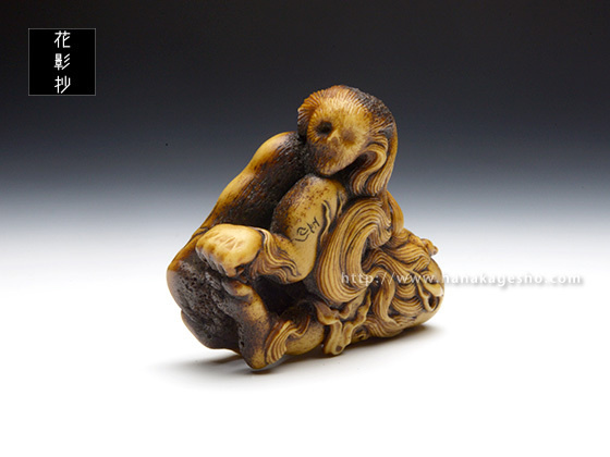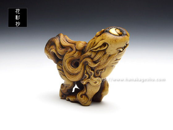 「根付のタイトル《霊獣 耆驪目》(れいじゅう しりめ)ですが、 “耆”は老いるの意、“驪”は黒毛の馬のこと、“目”はそのまま尻目の“目”です。“老成し黒馬の如き姿の霊獣と成った尻目”を意味する当て字です」(至水) |