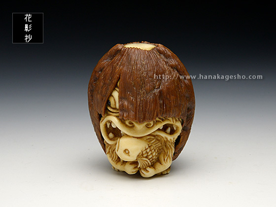 河童は全国各地に伝承が残る妖怪ですが、その土地土地で姿形の違いが見られます。「猿猴」は広島や中国、四国地方に伝わる妖怪で、全身毛むくじゃらの河童の一種です。製作当初「魚に齧り付く河童ヘッド」を彫っていた筈なのですが、胡桃の丸さに導かれ気が付けば手が生え足が生え、ほぼ一頭身のキャッチ―な水妖が爆誕しておりました。本当に・・・胡桃は良いものです。(至水)