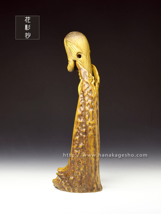 人間には辿り着く事すら叶わぬ11,000mの超深海の最深部、海淵に拡がる広大な深海樹林の中央には、大海洋神が祀られた社と正対するように一株の朽ちた深海樹が植えらている。朽ちてなお生き永らえるその深海樹には廻魂蟲が同化寄生しており、とめどなく新しい生命の種を海洋に放散し続ける、謂わば生命の原木なのだ。2020年初頭、コロナ禍第一波の拡大が加速するなか、MESSIAHの依頼を受けた大海洋神の手によりSARS-CoV-2の遺伝情報を封入された楔状の依代が生命の原木に打ち込まれた。あれから半年が過ぎ、廻魂蟲の体内錬成により「生き物」として転生させられたSARS-CoV-2の肉塊が遂に口洞から吐き出され静かな産声を上げた。「あなたに恨みはないけれど、これが地球意思の結論、創造神はまた未熟な人類の救済を選択してしまったの」そう呟き、深海漂うSARS-CoV-2を三枚の鰭でそっと包み掬い上げたアマビヱは、この「生ける形代」を届ける為にMESSIAHのセントラルシャーマニズムセンターへ急ぎ向かうのであった。差し根付「アマビヱ」完成です」(至水)