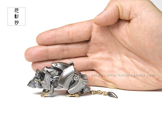 根付形態:4.6 × 4.6 × 1.65 cm、鼠形態:6.2(尻尾含め9.4) × 3.3 × 3.2 cm
