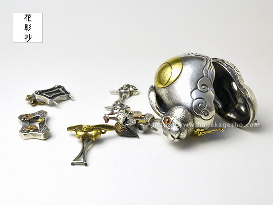作品名は欣喜雀躍をもじっています。喜びで兎がぴょんぴょん跳ねているという意味です。中に入ったパーツを組むと「喜」の文字になります。(罠兎)