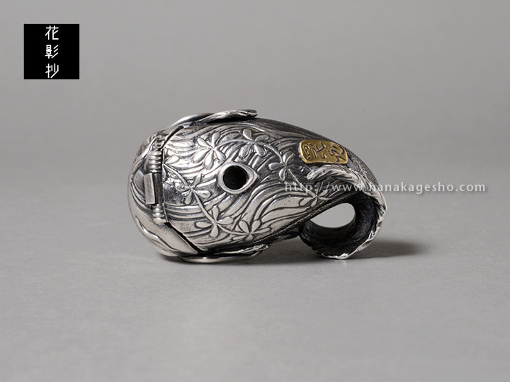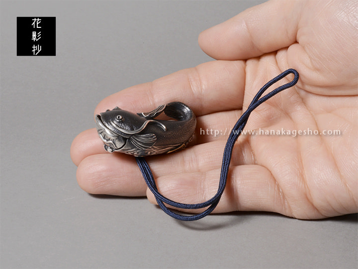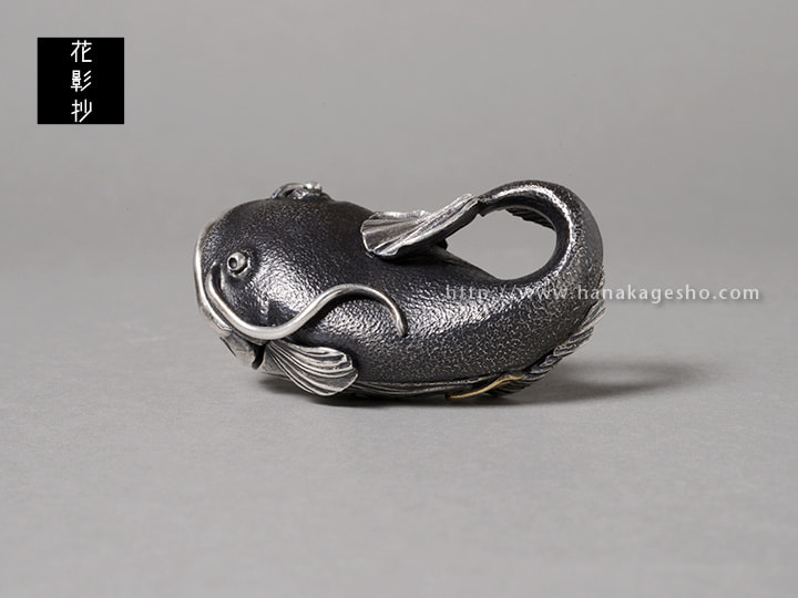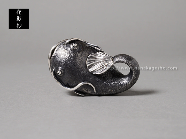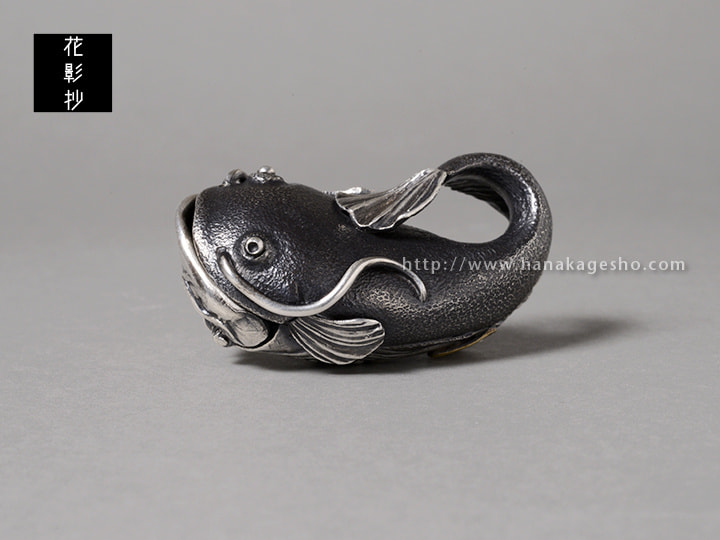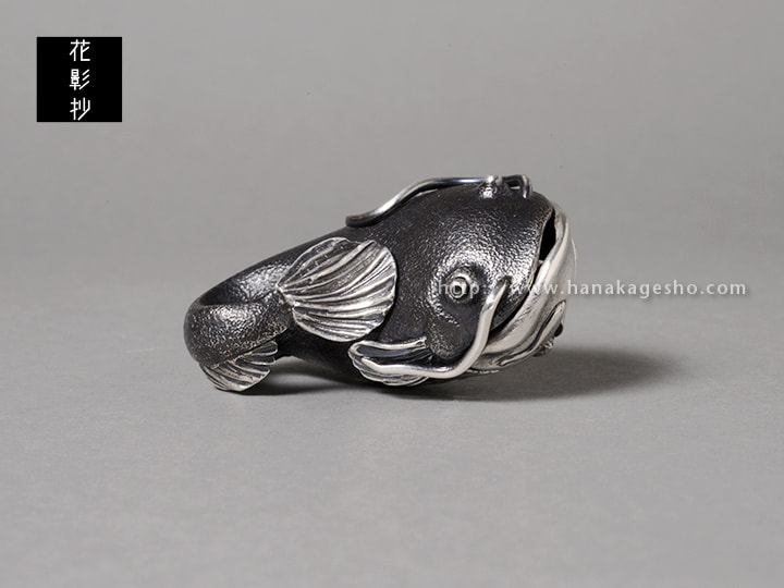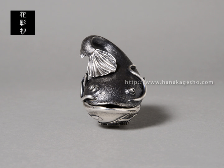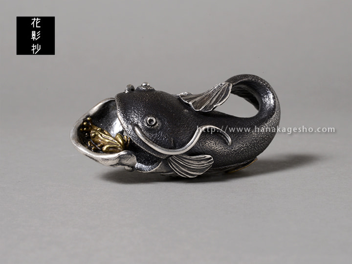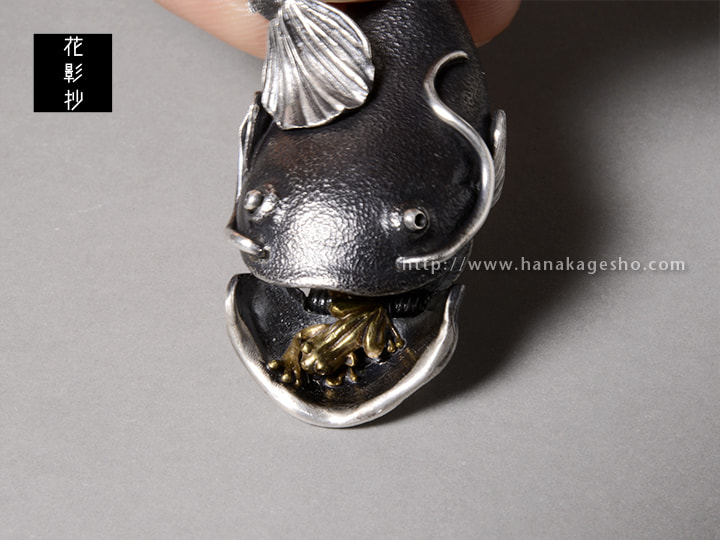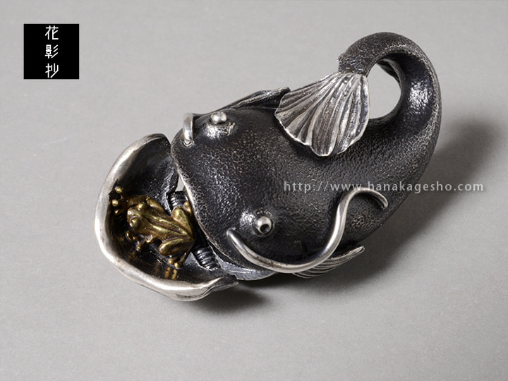 鯰の黒色の部分は、silverを燻して黒くしています。鯰のお腹に流水と水草を彫刻し、シンプルながら華やかさのある仕上がりになりました。口を開けると蛙が顔をのぞかせます。本来蛙は鯰の大好物ですが、ここでは仲良く暮らしています。(罠兎)