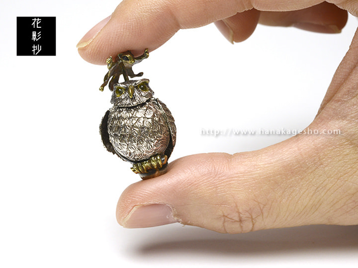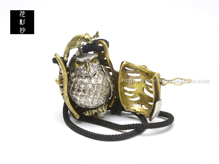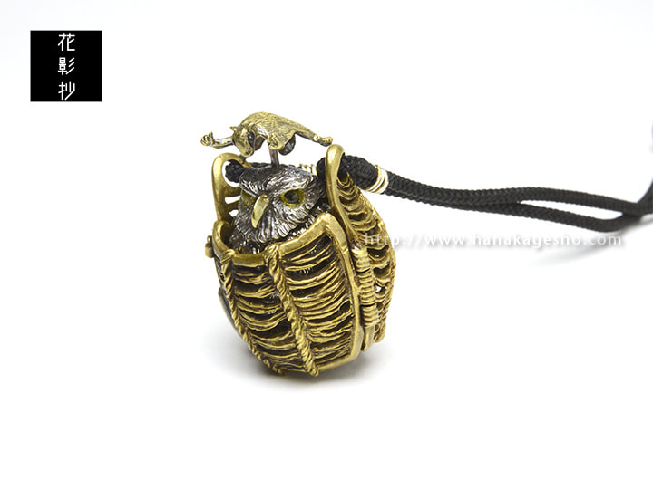 ふくろうとフクロモモンガの福づくしの提げです。モモンガを押すと羽がパタパタします。(罠兎)