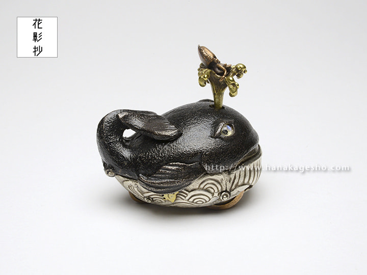 郷土玩具のくじら車がモチーフです。車をうごかすと潮が上下に動きます。素朴なおもちゃっぽい動きと潮に吹かれているイカがチャームポイントです。潮の部分はネジで取り外しできます。(罠兎)