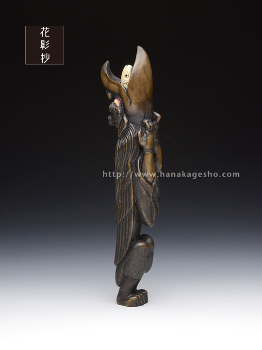 柳田国男の『山の人生』(大正15年)には、石川県の能美郡遊泉寺村で老人が神隠しに遭ったとき、村人が「鯖食った伊右衛門やい」と口々に唱えて探し歩いた、と書かれています。柳田のこの記述で、近代民俗学の分野から「天狗の鯖嫌い」は民間に広がっていったと考えられますが、歴史的に絵画や工芸の題材になってはおらず、この三昧の根付は同モチーフ初めての工芸化といえるかもしれません。 なぜ天狗は鯖が嫌いかということに関しては、鯖は古来より「産飯(サバ)」という音から転じて特別な霊力を宿す神饌と考えられていたようです。神に供える霊力が、人間を攫ったり悪戯をしたりの害を与える妖怪・天狗にとっては毒になるという考え方となり、「天狗は鯖を嫌う」発想に結びついたのでしょう。 |
