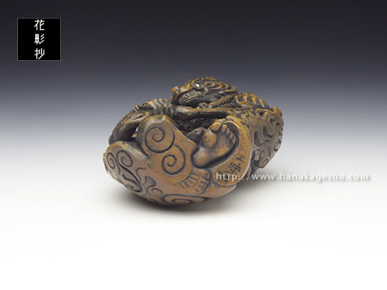 「この年(令和二年)新型コロナウイルス(COVID-19)の世界的流行により世界は多大な被害を受けています。江戸時代日本では、文政コレラが流行したとき“コレラ(虎列刺)”と当て字が付けられ“コロリと死んでしまう”とのことから“虎狼狸”という呼び名も広く用いられたそうです。今回の作品も、その当て字のヒントをいただき見えない敵を具象化してみました。そして“疫病退散”の守護神である不動明王と供に作品にしました。 令和二年五月十六日」(三昧)