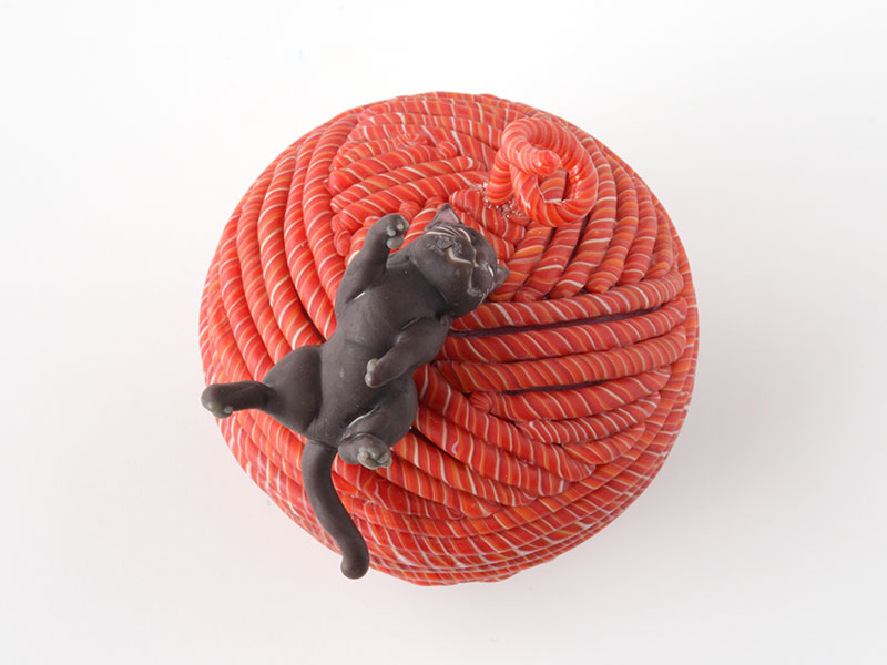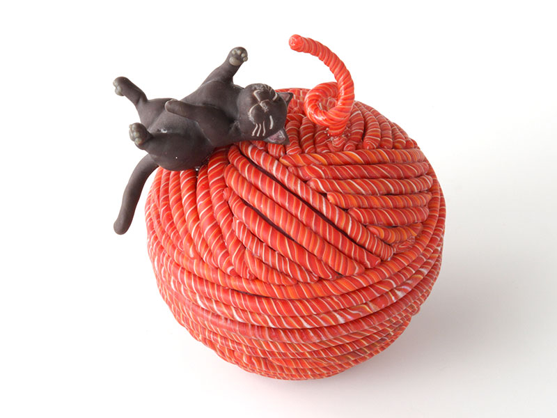こちらは北澤美術館で展示された、昨年制作された作品ですが、秋葉絢さんの作品との出会いは、この作品と同じデザインの作品でした。ガラスなのに柔らかく暖かな感触の毛糸玉とキュートな黒猫。2006年頃だったと思います。当時、不覚にも秋葉絢の名前も知らなかった私が、個展のDMを見て、もっと知りたい!もっと他の作品も見たい!と住宅地の小さなギャラリーを訪ねたことを懐かしく思い出します。(Y.H)
